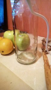 Add the fruit or juice, in this case apple. I used equal amount of apple to cinnamon, or I tried to anyway. You’ve got to be careful on the ratios for how much of this stuff you add in terms of flavor and sugars. If you add too much sugars, the yeast will go crazy and your kombucha will be too foamy.